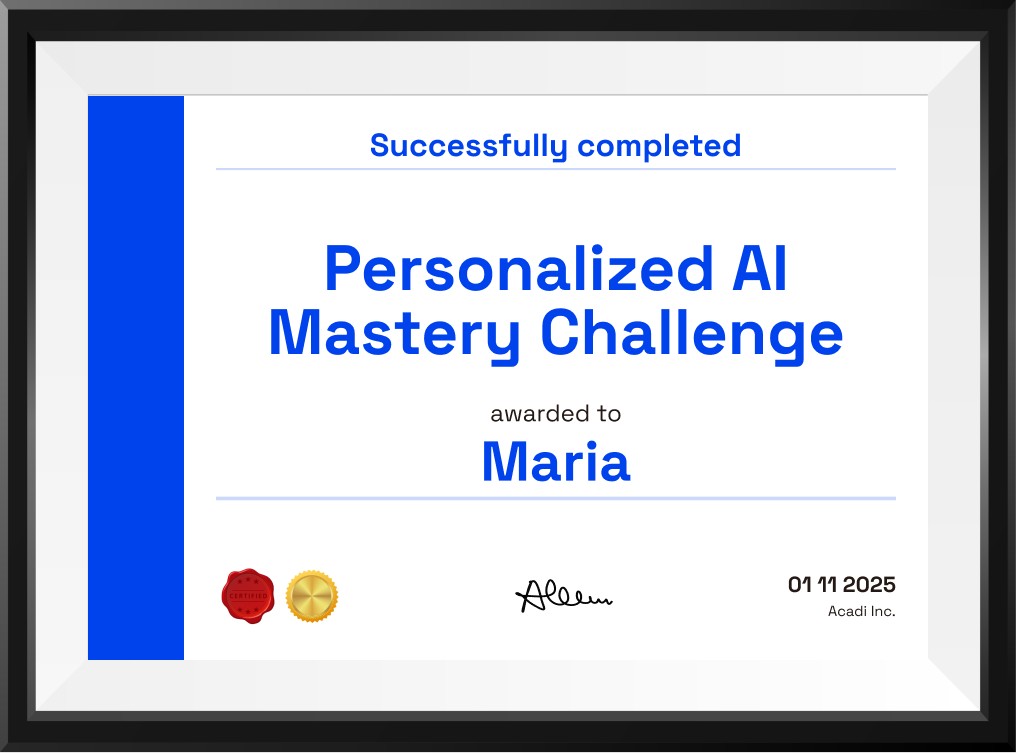 Bring it all together, complete your personalized challenge, and unlock your AI Mastery Certificate, approved by leading companies.